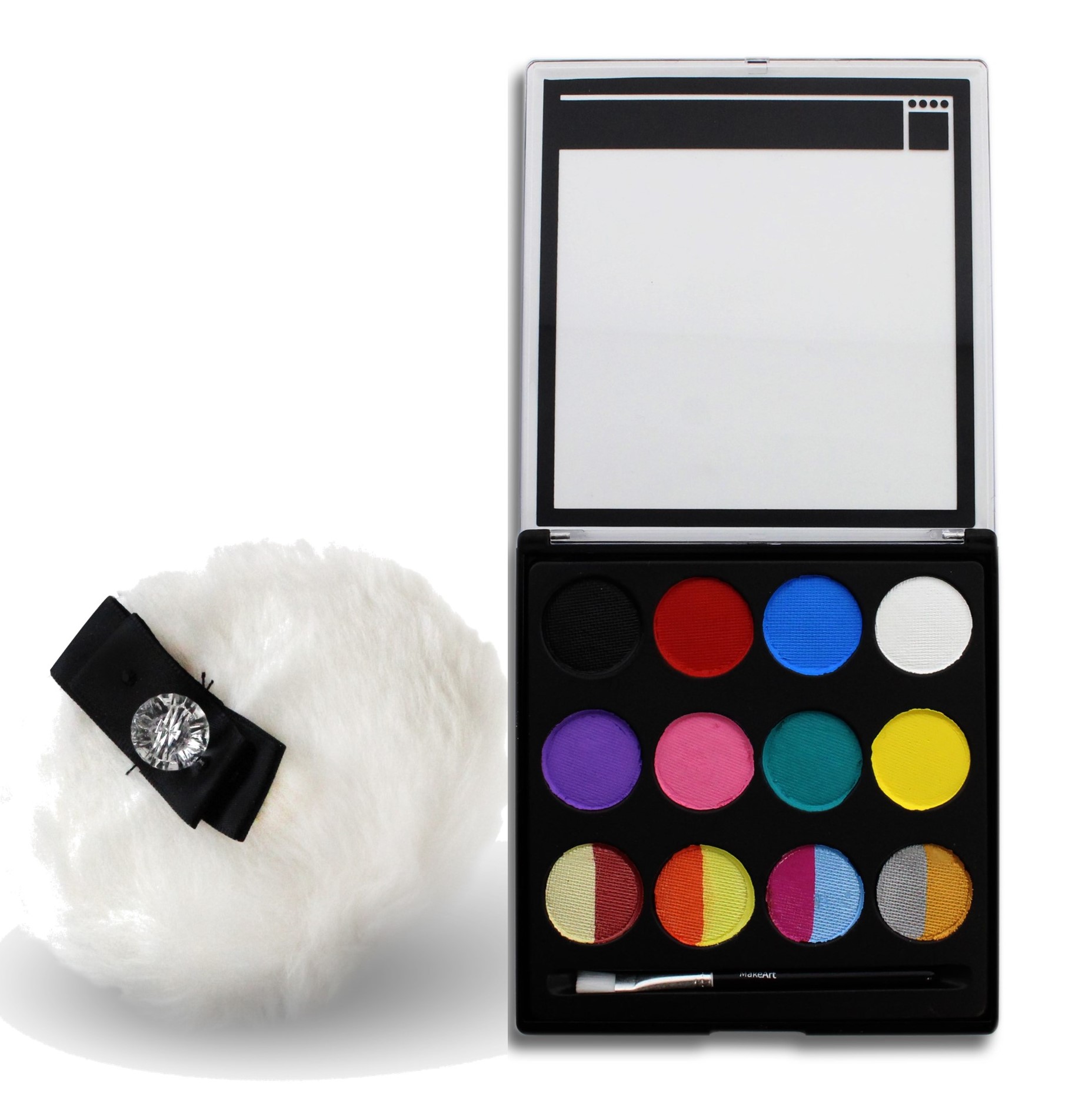 MAKEART פלטת צבעי גוף ופנים מקצועית – פלטת צבעים איכותיים על בסיס מים לצבעי פנים וגוף נמביאה עמה בשורה חדשה לתחום צבעי הגוף באיכות גבוהה ובמחיר ללא תחרות! הפלטה מורכבת מ-8 צבעים נפרדים בגימור מאט ומ-8 צבעיים מטאליים המחולקים לזוגות. כל הצבעים על בסיס מים ונטולי שומן, מתאימים לאיפור גוף ופנים. עמידים מאוד, בעלי פיגמנט חזק, כיסוי מלא ואטום. את תמרחי עליהם. לצד אלה מציעה הרשת מגוון רחב של מוצרי איפור וביוטי מנצנצים, קעקועים, מוצרי קישוט לגוף, אביזרים לחג ומגוון רחב של מוצרי איפור לכל גיל.