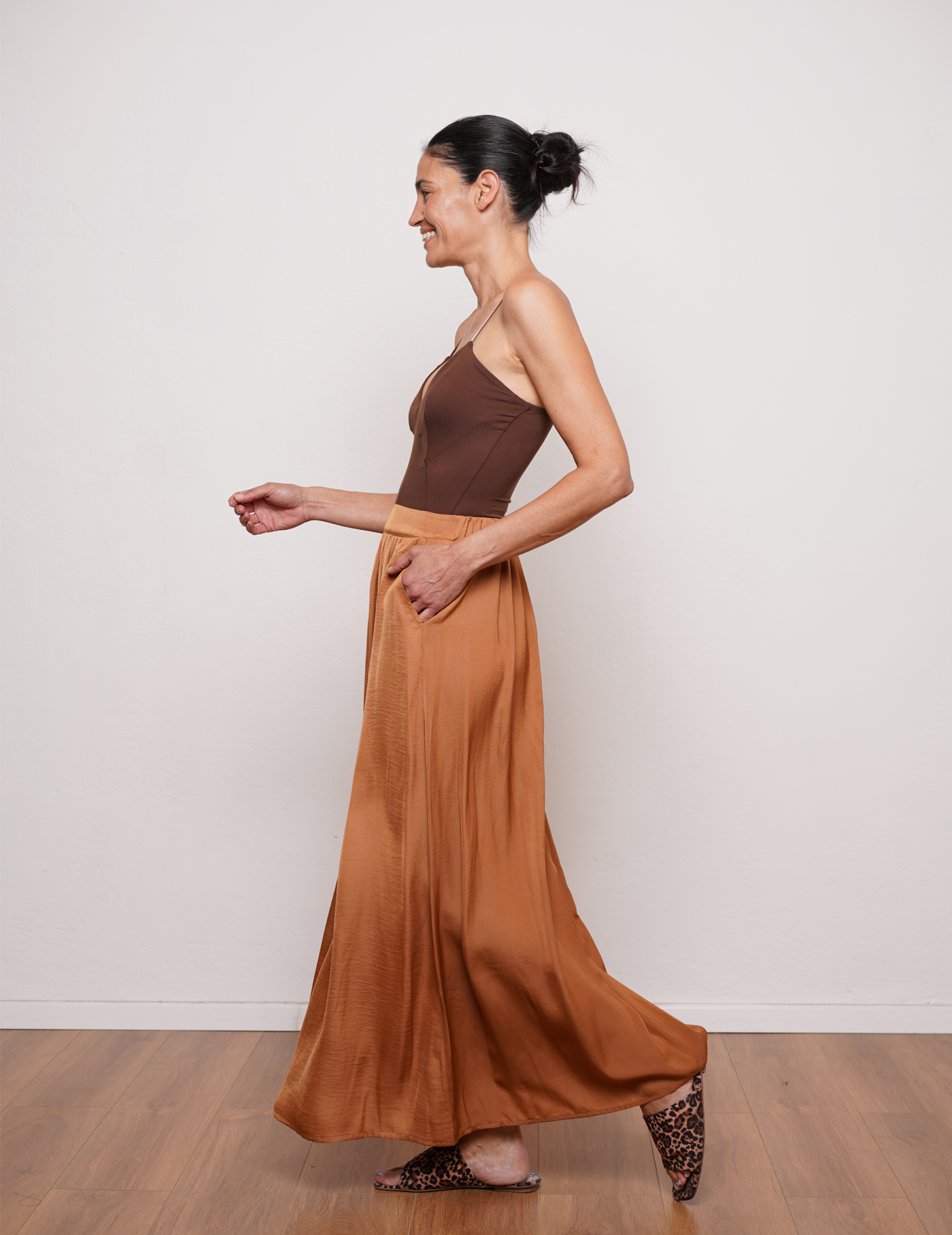לוח הצבעים של הקולקציה כולל שחור, לבן, וגוונים אדמתיים כמו חום שוקולד, בז' מדברי, ובורדו, עם נגיעות של ורוד. הדפסי החורף כוללים פסים, צורות מופשטות, ורמזים לחיות ופרחים. הבדים שנבחרו, כמו כותנה, ויסקוזה, טנסל, וסאטן, נבחרו בשל הנוחות והנשימות שלהם, אידיאליים ללבישה לאורך כל היום.