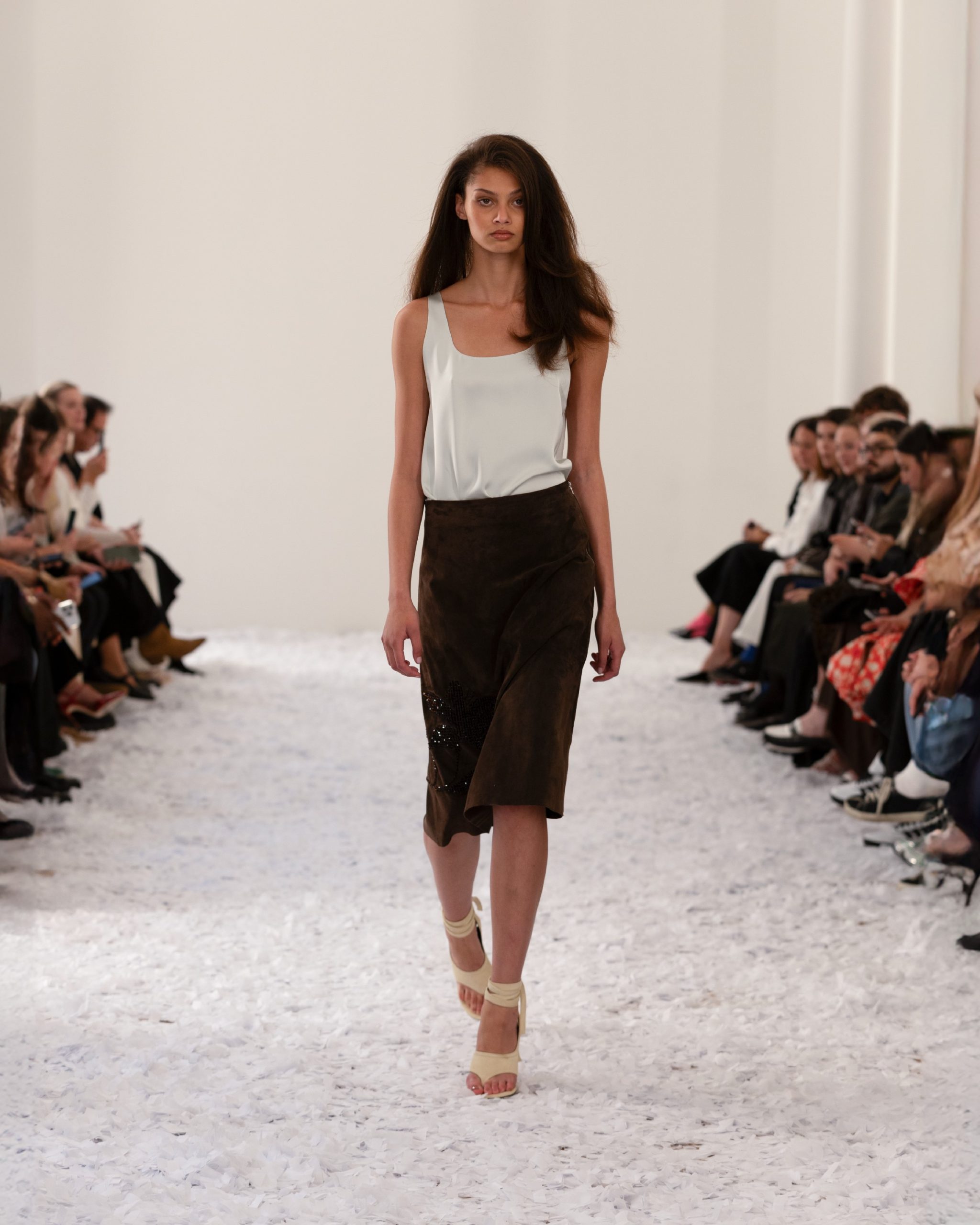 השמלות המובילות בקולקציה נעות על הציר שבין תחכום לקלילות יומיומית, תוך שילוב של בדים מתנפנפים, גזרות חושפות כתפיים וגזרות שמדגישות תנועה חופשית. בין הדגמים הבולטים: שמלת מקסי עם מחשוף עמוק ושילוב קונטרסטי של שחור ולבן, שמלות ערב קלילות מבדי שיפון שקופים הרקומים בפאייטים עדינים, שמלות מקסי אדומות עם חגורות קשירה שחורות ודגמים הרקומים בפאייטים זהובים. כל אלו מדגישים את ה-DNA של המותג: אקספרסיביות שפוגשת עידון, תעוזה ואמירה נשית עוצמתית של סקס אפיל שקט.