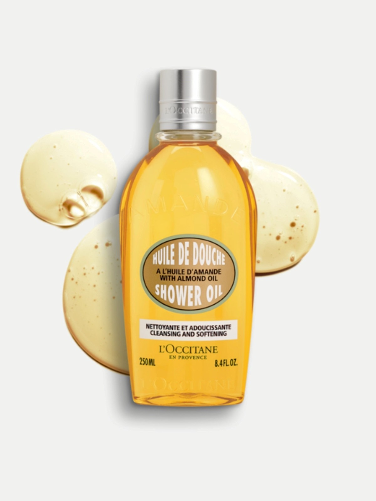 ALMOND SHOWER OIL של ל'אוקסיטן: שמן רחצה בניחוח שקדים משכר, שהופך לחלב רחצה עשיר במגע עם מים. השמן מנקה בעדינות את העור, משאיר אותו רך, לח ונעים למגע.
