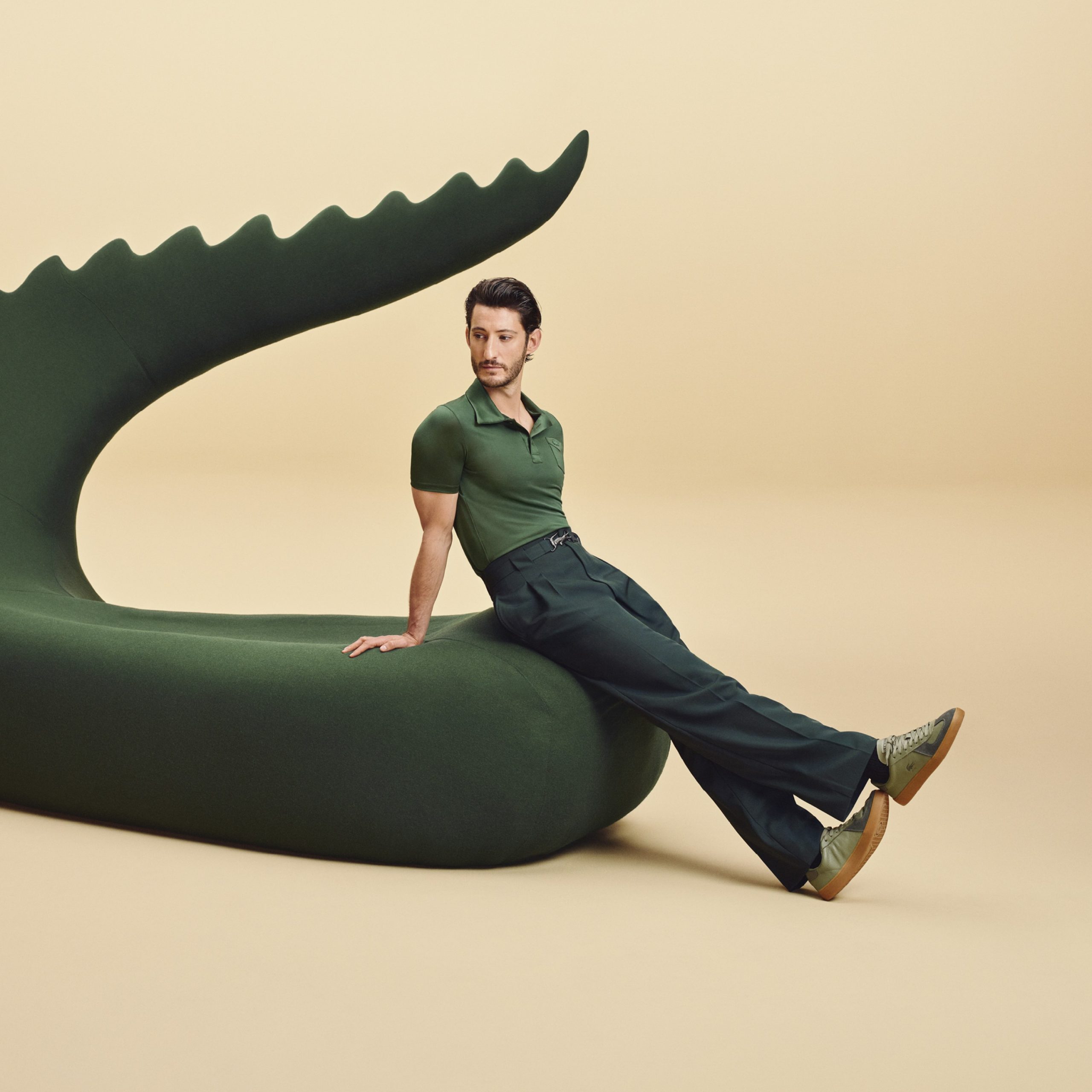 ופייר ניני? הוא פשוט מתרווח על ספה בצורת תנין, לבוש בירוק לקוסט המזוהה. התמונה המינימליסטית הזו מצליחה להחיות את התנין האייקוני בצורה הכי הומוריסטית ואלגנטית שיש. שאפו!