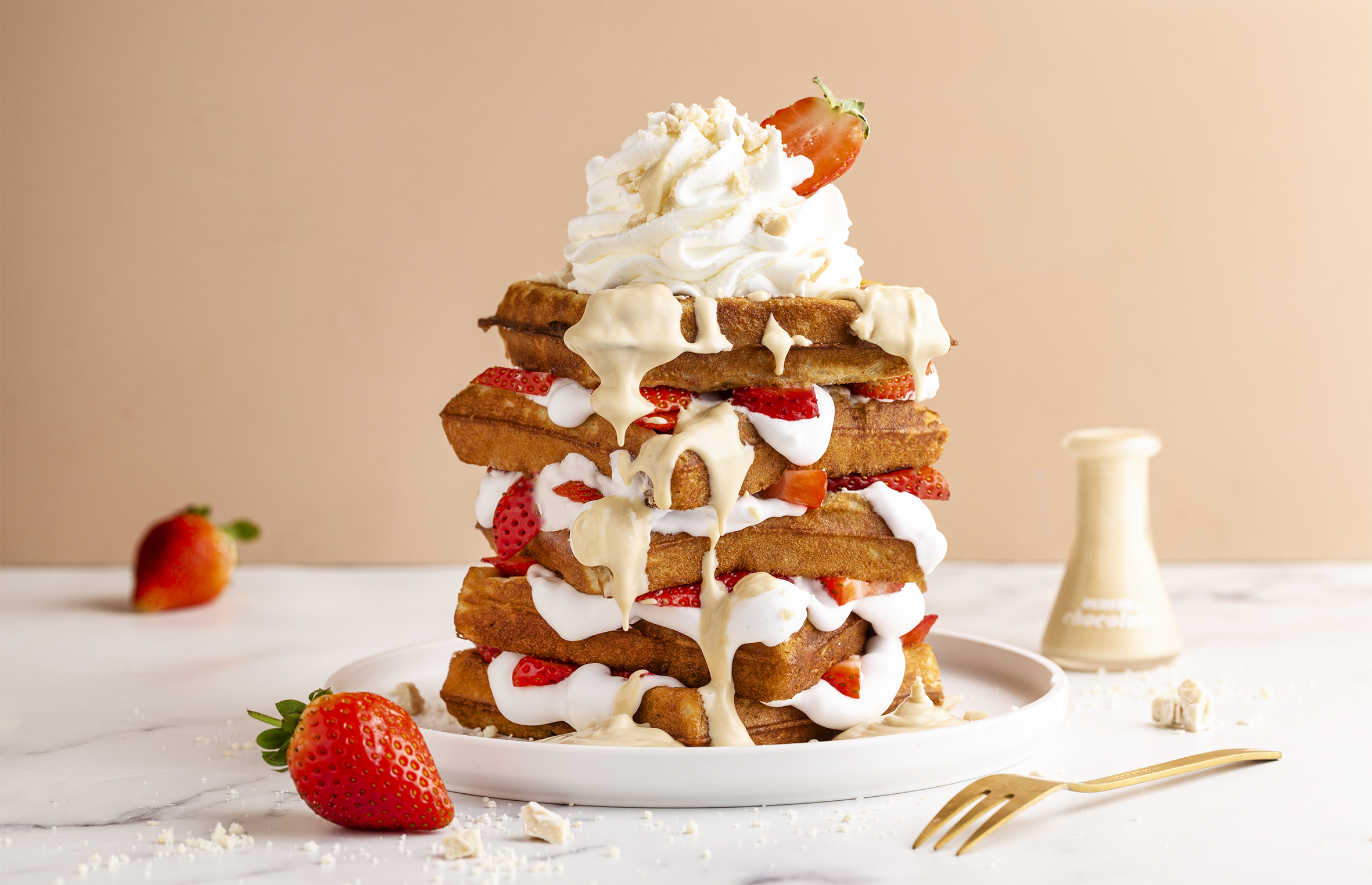 שלושה וופלים חמימים מוכנים להיטרף, עם תותים טריים, קצפת, שבבי שוקולד לבן, גלידת וניל, כדורי וופל, רוטב תותים, פירורים ושוקו חם שנשפך מעל. שיתוף מעולם לא היה מתוק כל כך.