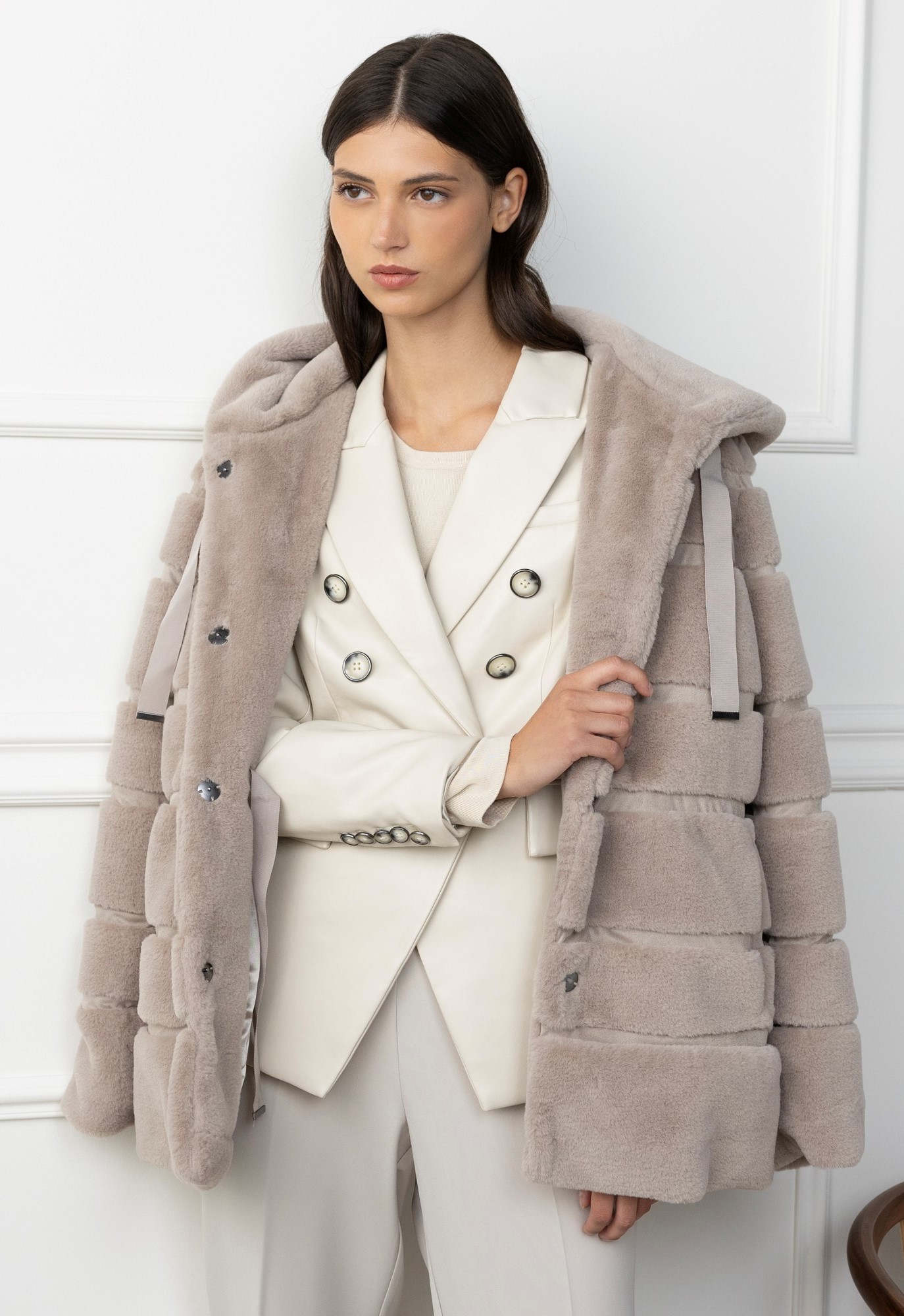 מעיל פרווה סינתטית 599 ₪, חצאית 299 ₪, חולצה 299 ₪, ג'קט 299 ₪, תיק 279 ש"ח, צילום שי יחזקאל