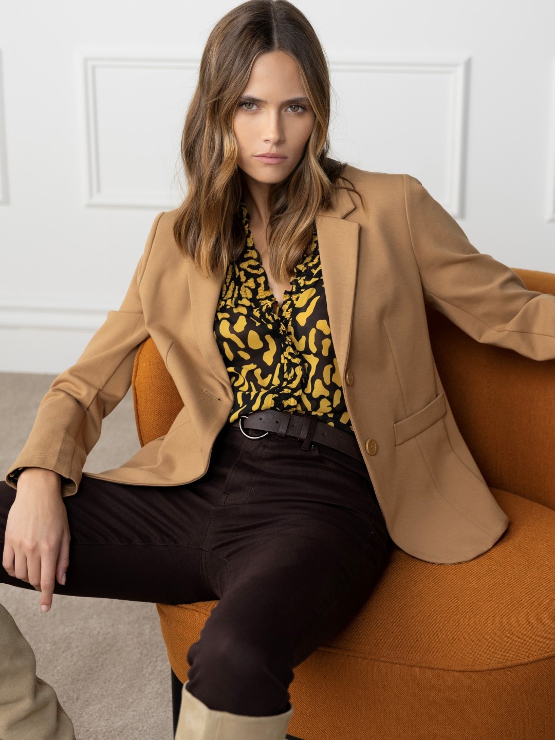 מכנס חלק מחליפה 459 ש"ח, סריג 299 ש"ח, קרדיגן 399 ש"ח, חגורה 99 ש"ח, תיק 149ש"ח, צילום שי יחזקאל