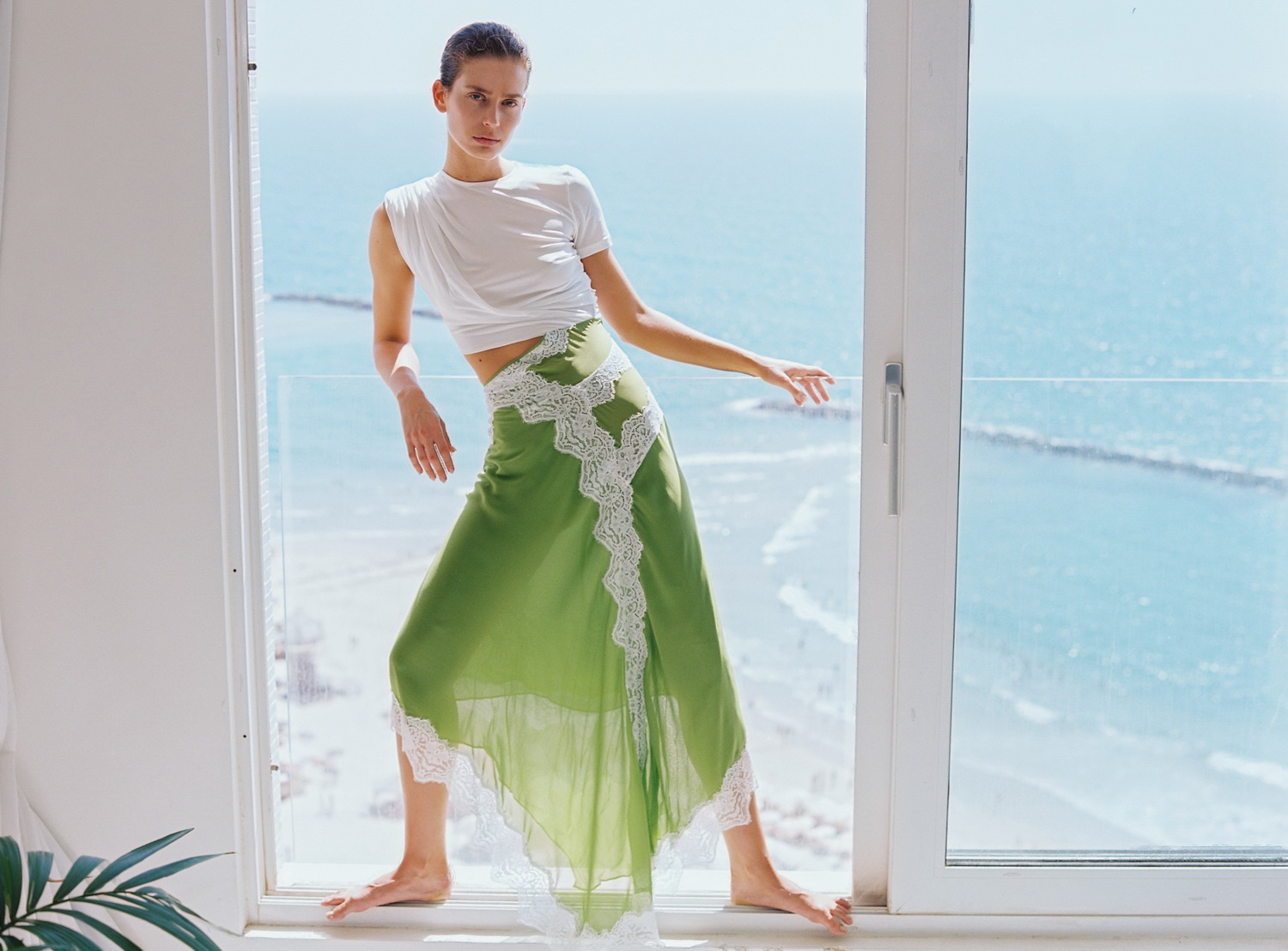 השמלה המדוברת, שצולמה על שון, כוללת חלק עליון בסגנון טי-שירט לבן המחובר לחלק תחתון הכולל חצאית משי ירוקה מעוטרת בתחרות. מדובר בדגם מרענן ומיוחד במינו.