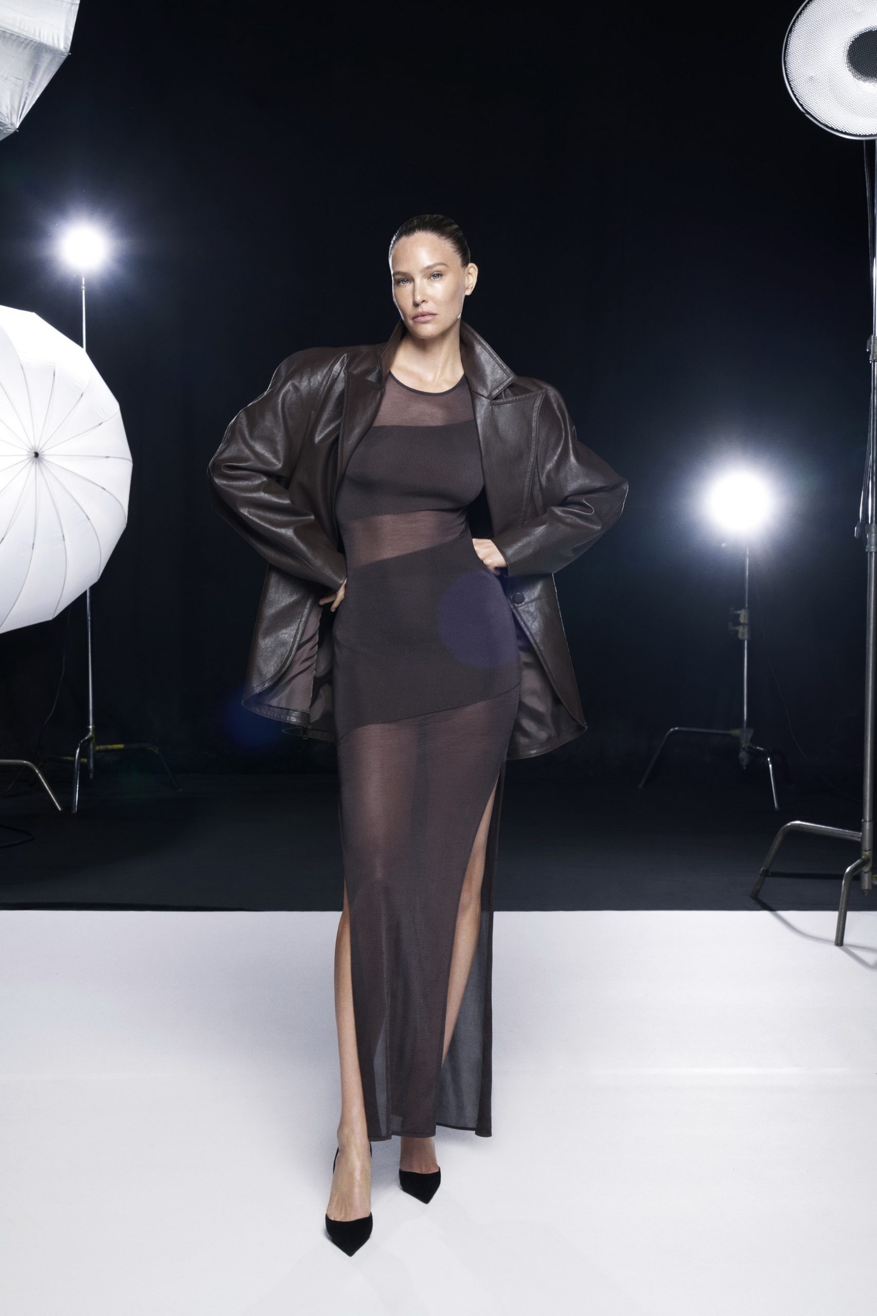 טופ חזייה מעוצב פלטת צבעים סתווית של שחור, בורדו, חום כהה ואפור, המשמשת כפריט משלים שמשתלב היטב עם הפריטים השקופים של הקולקציה למראה מגובש ונקי.