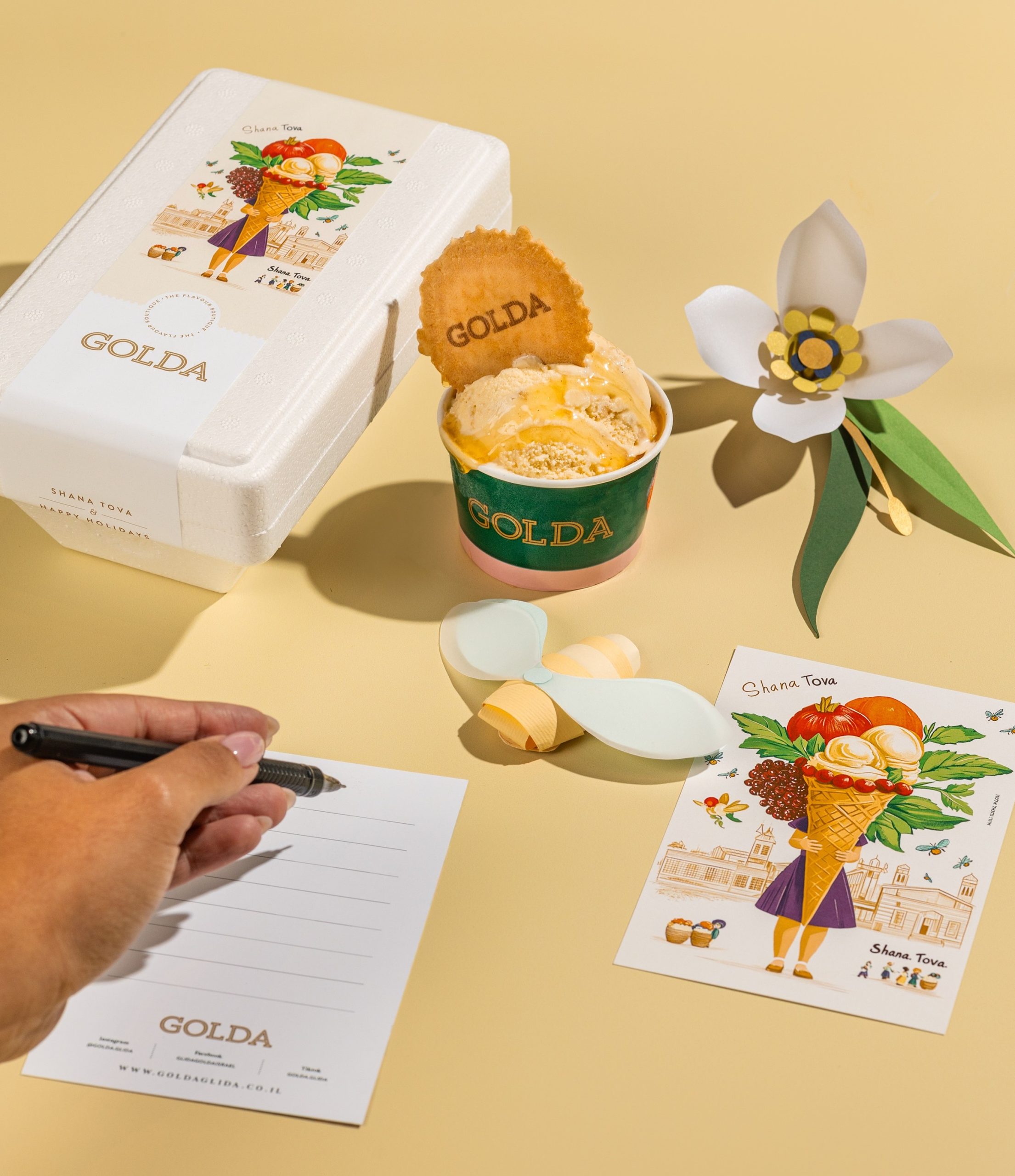 החל מה-1 באוקטובר, חובבי הגלידה יוכלו ליהנות מהטעם החדש "וניל קראמבל דבש", שילוב מענג של גלידת וניל וקראמבל דבש בהשראת רוח החג. זה לא הכל! מהדורת החג הזו מגיעה באריזה אמנותית המעוטרת בגלויות שנה טובה נוסטלגיות. אלה אינן סתם גלויות; הן כוללות איורים של שלושה מעצבים צעירים מוכשרים, בוגרי שנקר טריים: נתנאל אלמה, יובל כהן ולינוי יצחק. זוכרים את הימים בהם באמת שלחנו אחד לשני מכתבי שנה טובה? ובכן, גולדה מחזירה את המסורת המקסימה הזו עם טוויסט אופנתי.