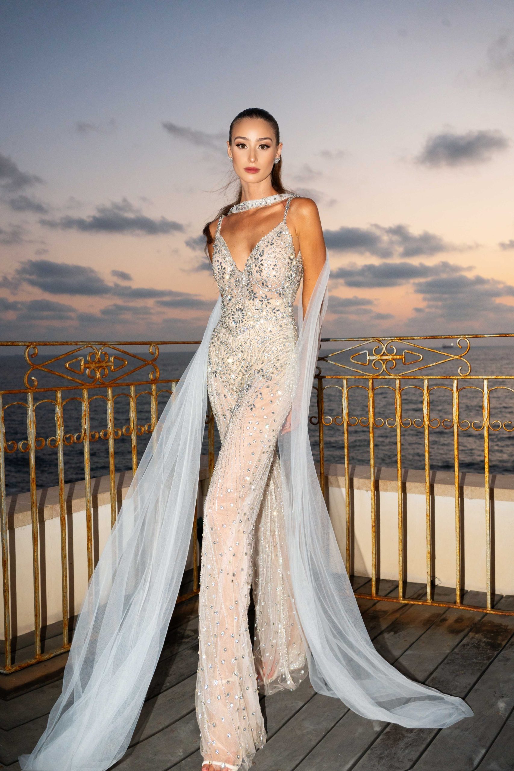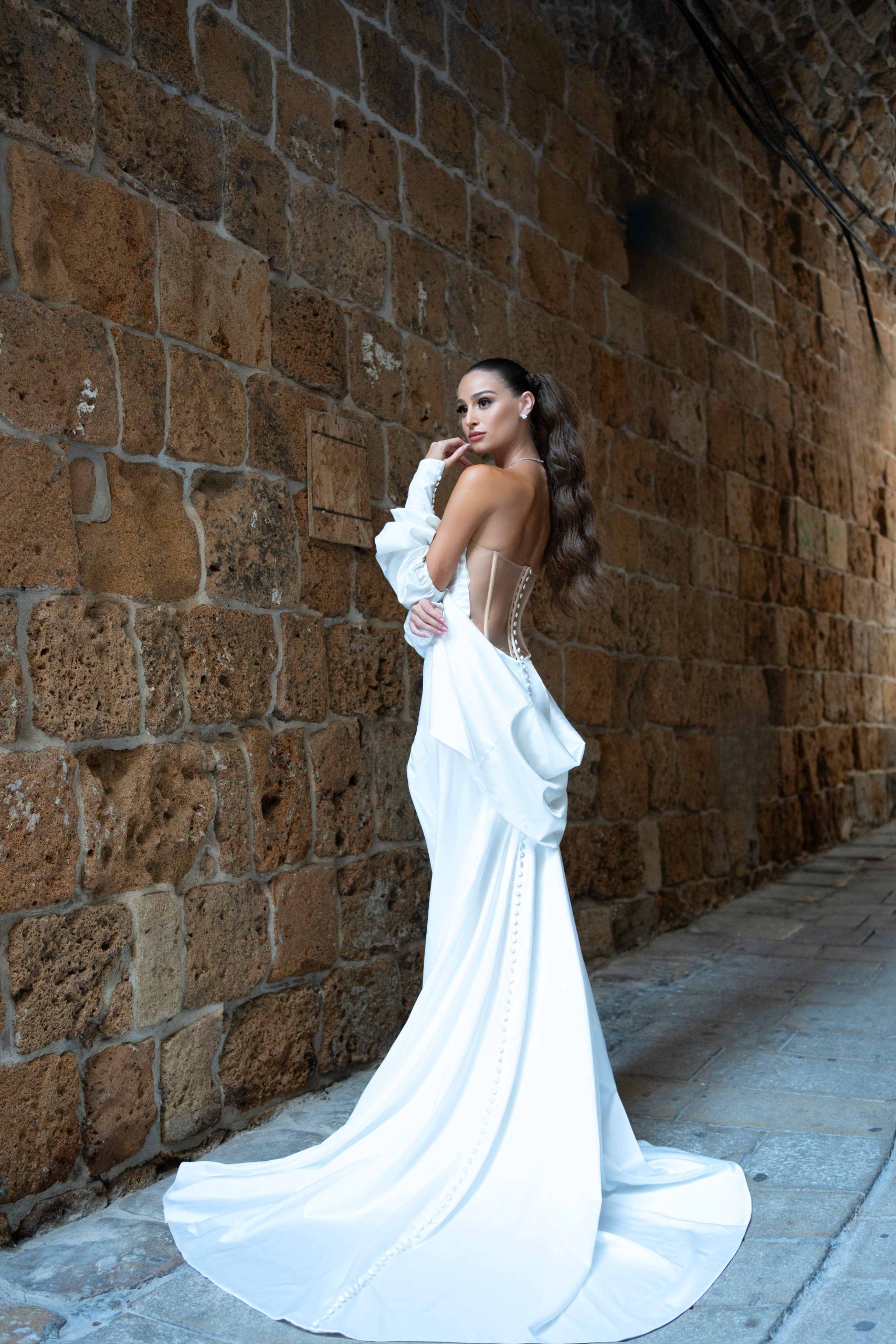 זוהי לא רק שמלת כלה, אלא יצירה עוצמתית עם נוכחות דרמטית שעברה התאמה אישית. השמלה כוללת חצאית נפוחה שמתנפנפת, שובל ארוך ושופע, ומחוך המשלב כפלי סאטן מבריקים, פנינים וחרוזים מרהיבים. עם מראה כלתי נקי וטוויסט ייחודי, המחוך והגב של השמלה מעוטרים בחרוזים וכפלים בעיצובים גאומטריים. בהשראת היופי השמימי של האלות, השמלה עוצבה באופן ייחודי כדי להדגיש את יופיה ומבנה גופה הגבוה והארוך של רומי. השמלה מתהדרת בבד יוקרתי ובעיצוב מתוחכם, בעוד הסנדלים מלפפים את רגליה של רומי ומעוטרים בפנינים, בדומה לאלו השזורים במחוך השמלה.