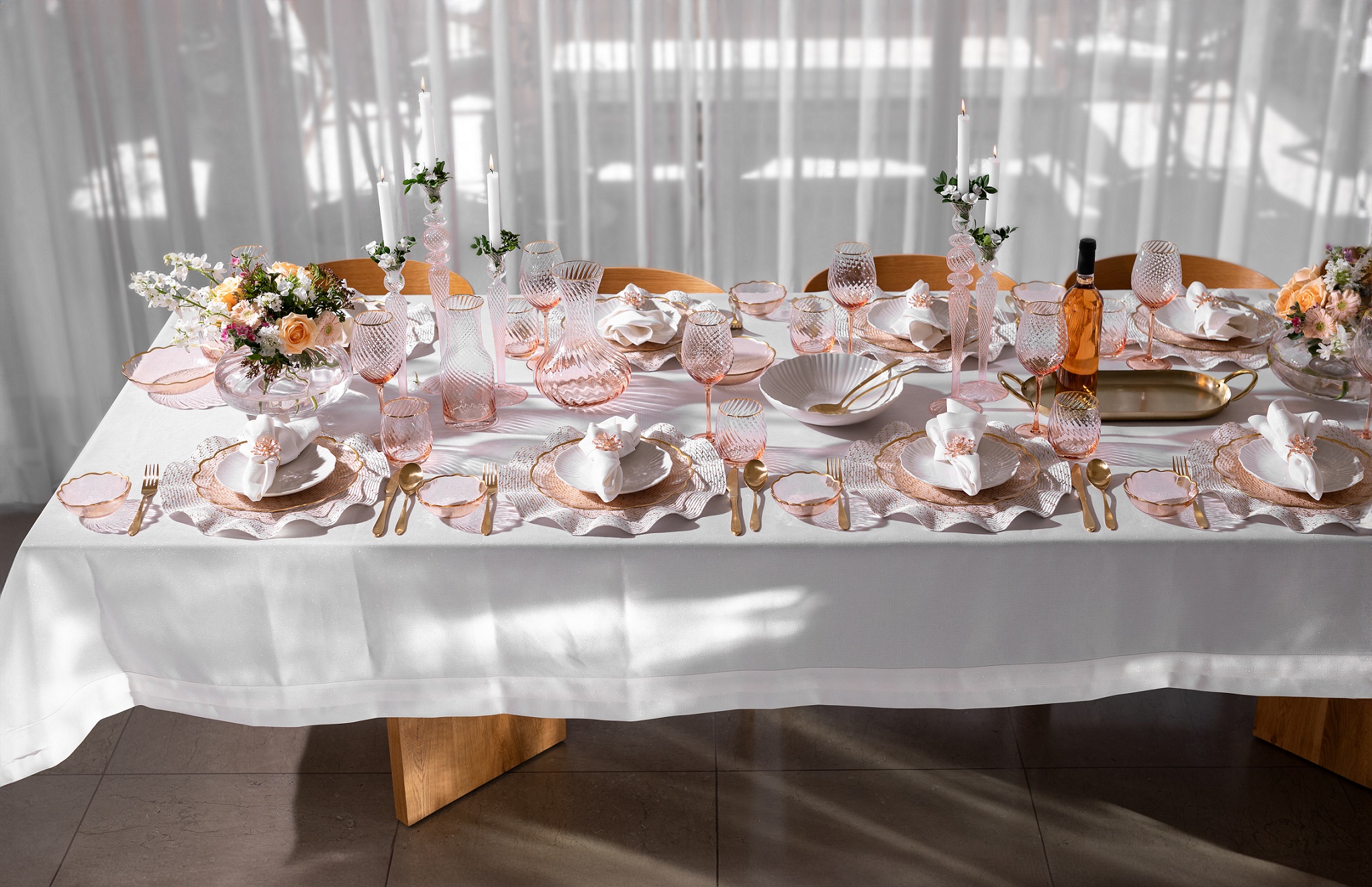את השולחן נלביש בפריטי טקסטיל קלאסיים כמו מפות שולחן במגוון גדלים בצבע שמנת עם נצנוץ ורדרד ומעליה נפרוס ראנר מנצנץ בצבע אפרסק, בו שזורים חוטים מוזהבים מבריקים. פלייסמט תלת מימדי עם שוליים המדמים עלי כותרת ענקיים יעניק לשולחן תחושה סידור פרחים מיוחד. על גבי הצלחות נניח מפיות בד, שאותן נעטוף בחבקי חישוק זהב מודגש ובוהק, עם דוגמת פרח תלת מימדי במראה זכוכית מנצנץ, המתכתב עם טל הבוקר. להשלמת המראה המנצנץ מומלץ להוסיף פילרים בניחוחות פריחה אביבית, עם נגיעות של קונפטי זהב. להשלמת האווירה נקשט את השולחן באגרטל זכוכית נמוך, המתאים לבוקה פרחים בצבעוניות משלימה של גווני ורוד, בננה, לבן ואפרסק, לצד פמוטים גבוהים לנרות, עשויים מזכוכית דקה ועדינה עם סיבוביות מתפתחת.