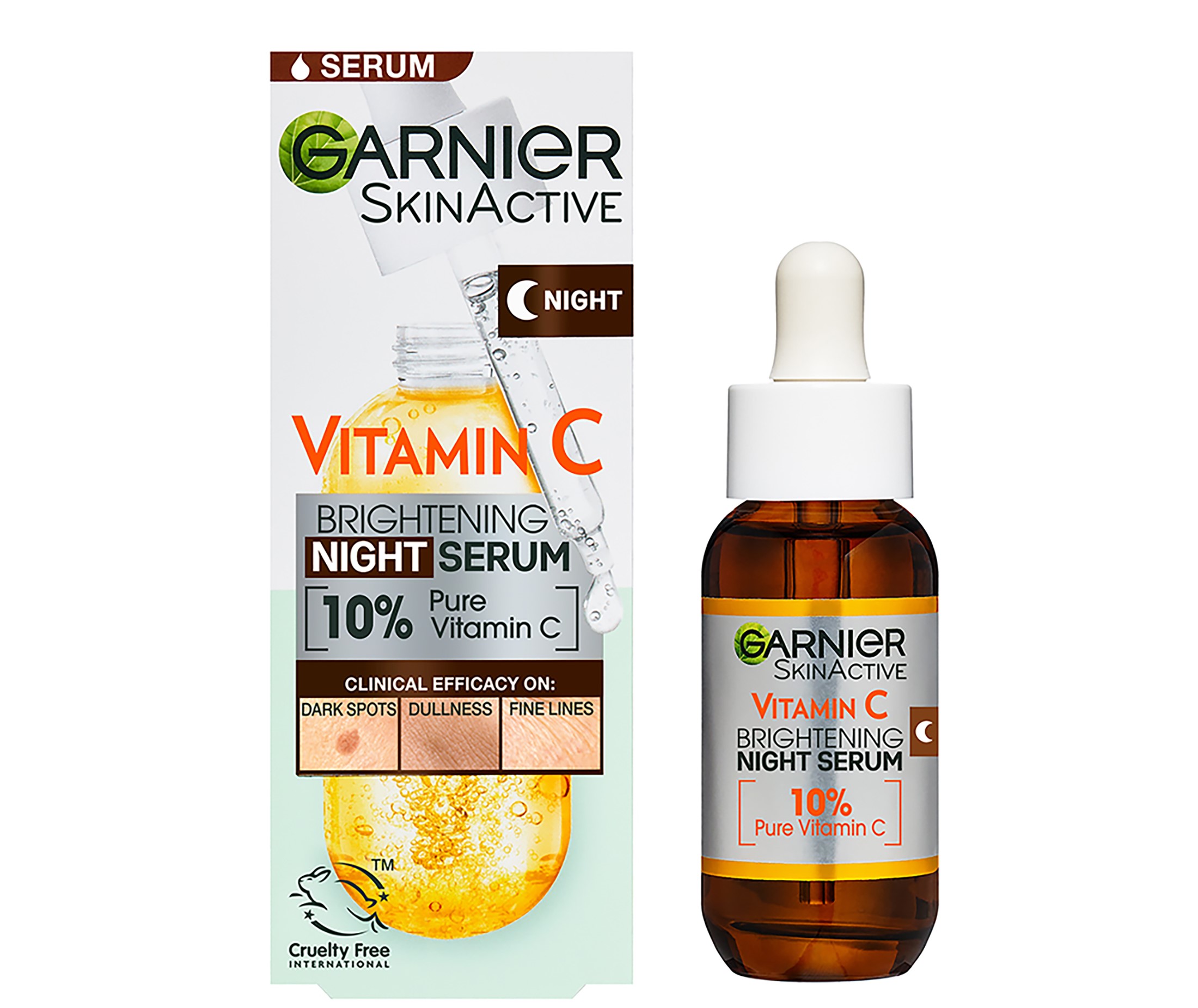 לאחר 3 שנים של מחקר מדעי, מעבדות גרנייה השיגו פריצת דרך אמיתית ומשיקים את סרום לילה ויטמין *C: פורמולה יציבה בעלת 10% ויטמין C טהור . ויטמין סי  C טהור מהווה רכיב פעיל במיוחד בצורתו הטהורה ביותר וידוע כנלחם במראה עור עמום, כמסייע בהעצמת המראה הזוהר של עור הפנים, הודות לנוגדי החמצון שיש בו. בנוסף, הסרום מכיל חומצה היאלורונית הידוע כרכיב פעיל המסייע בהזנה והחלקת העור.