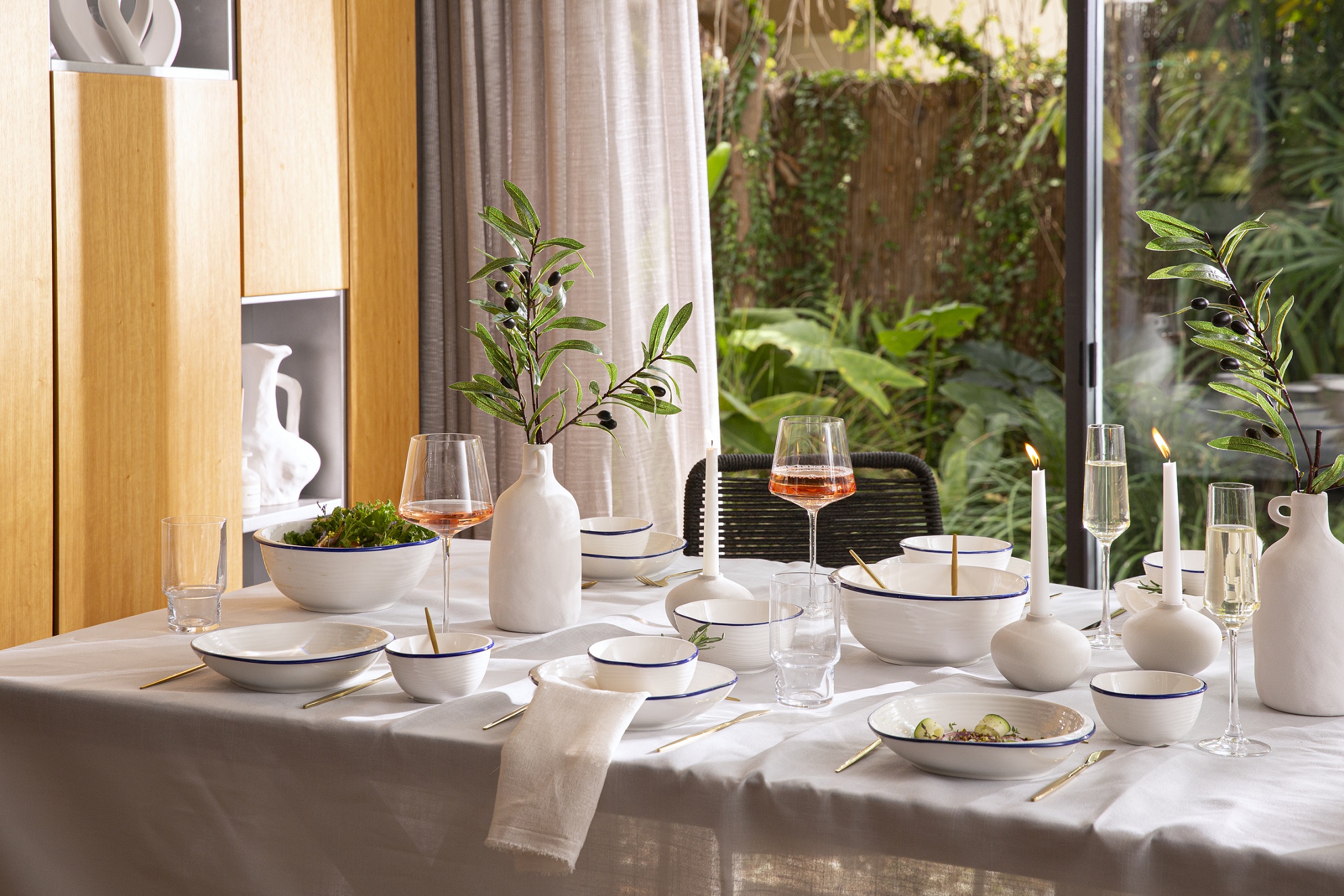 קולקציה קלאסית וחגיגית, המשלבת כלי קרמיקה לבנים עם רים כחול א-סימטרי במראה של עבודת יד. הקולקציה כוללת קערות, קעריות וצלחות בגדלים שונים, היוצרים יחד משחקי גבהים מעניינים על השולחן. השילוב של כחול ולבן הופך את הסט לאידיאלי גם ליום העצמאות ולמועדי ישראל נוספים. להשלמת המראה, מומלץ לשלב את הכלים עם כוסות זכוכית שקופות וסכו"ם מוזהב.