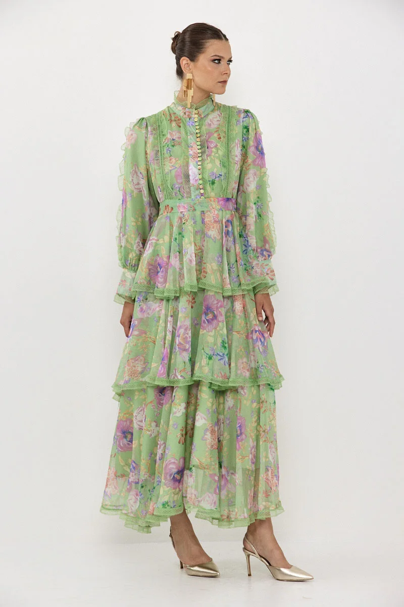 SALINA שמלה שיפון בגזרת קומות בהדפס פרחים ירוק 519 ₪ / צילום באדיבות המותג
