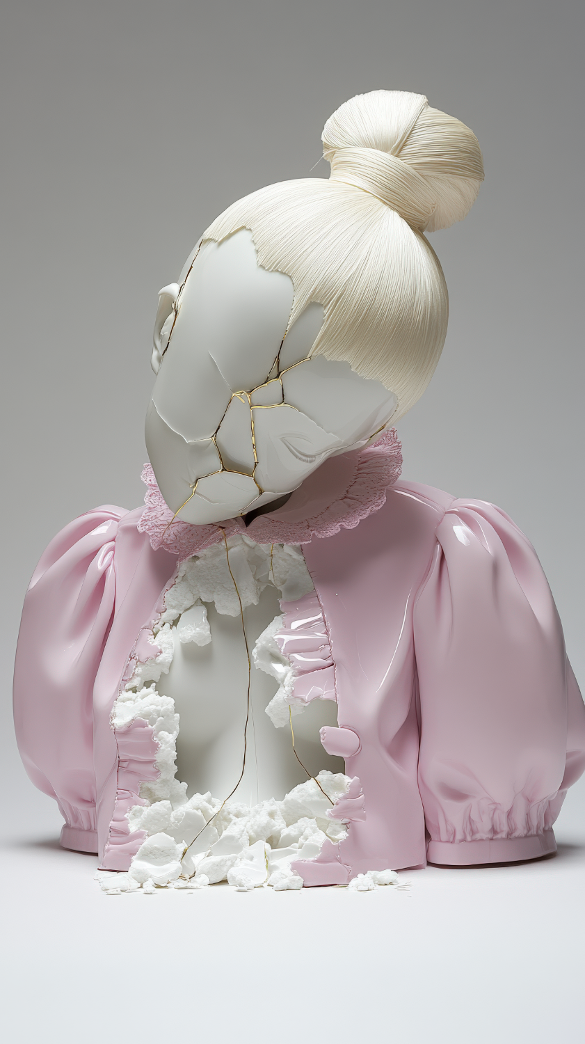 התערוכה כוללת 11 עבודות וידאו שנוצרו כולן בבינה מלאכותית, אך שומרות על עקביות ויזואלית מדהימה: אובייקטים עשויים מפורצלן לבן שבור, שמחוברים מחדש באמצעות חוטי זהב דקיקים. ההשראה מגיעה מהפילוסופיה היפנית וואבי-סאבי, שחוגגת את היופי שבאי-שלמות ובשבריריות. רותם לוקח בגדים, פרחים, מסכות ואפילו דמויות, שובר אותם ומחבר אותם מחדש בעדינות, כאילו מישהו התאמץ לשמר את מה שנשבר, ויצר ממנו משהו חדש ומלא משמעות.