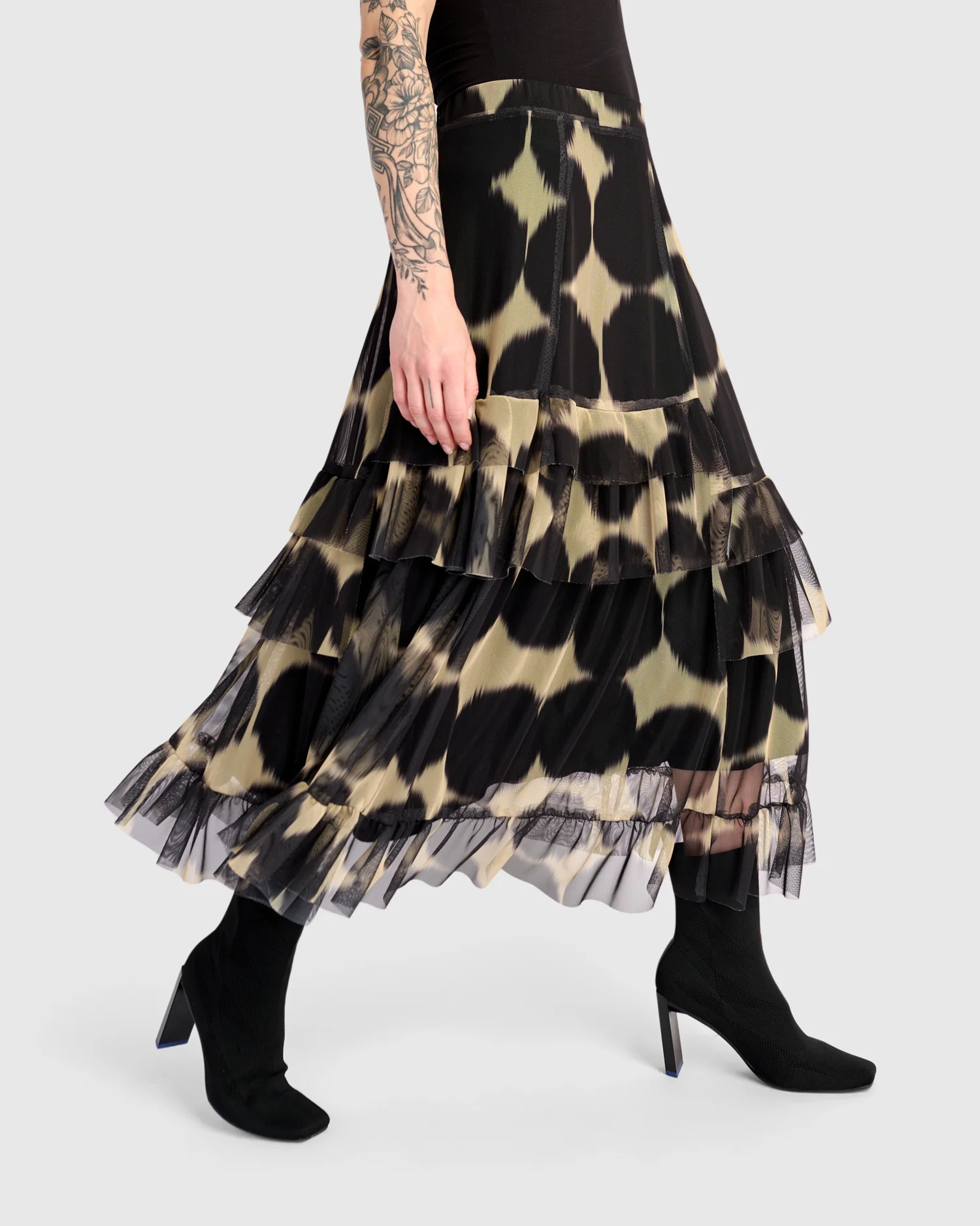 חצאית עלי שלכת עיגולים של אלמביקה היא יצירת אמנות לובשת – שכבות קלילות, הדפס עיגולים נועז ומשחק תנועה שמכניס חיים לשולחן החג. מתנה לעצמך שתהפוך כל לוק לחגיגה.